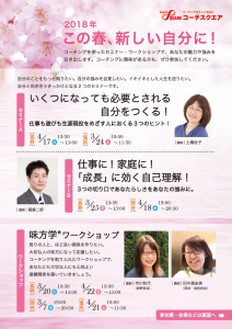 2018もコーチングアカデミーではコーチスクエアと連携して、春セミナーを開催いたします。2018年を昨年よりももっと豊かに充実したものにするために、コーチングアカデミー出身のインストラクターや味方学®ファシリテーターがみなさまにセミナー&ワークショップをお届けします。